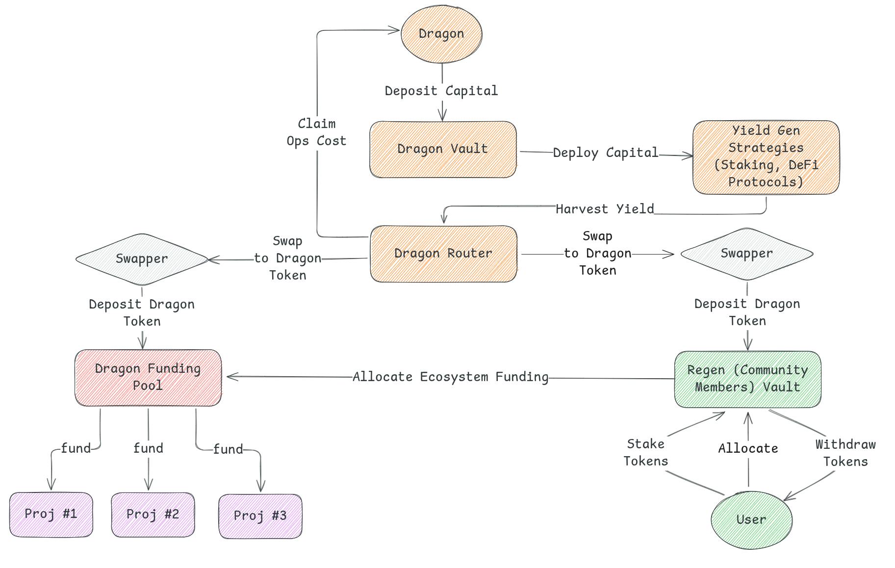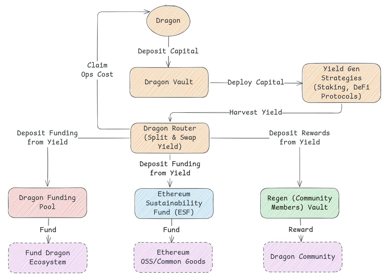 For instance, if Golem Foundation (GF) joins the protocol as a dragon, it deposits its capital into the Dragon Vault. GF's main sustainable funding stream is solo-staking of 100K ETH on its own infrastructure. The staking rewards or other forms of yield are funneled into the Dragon Router.