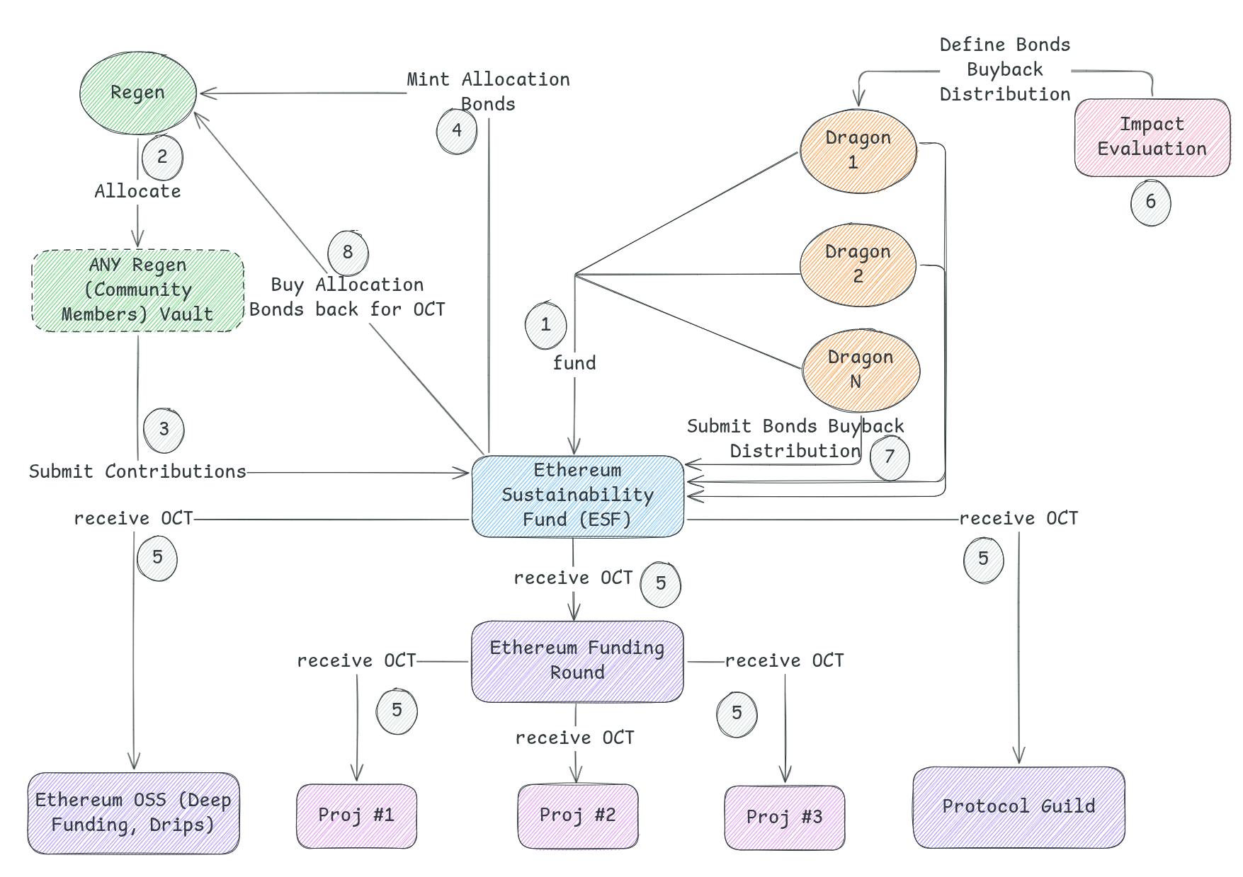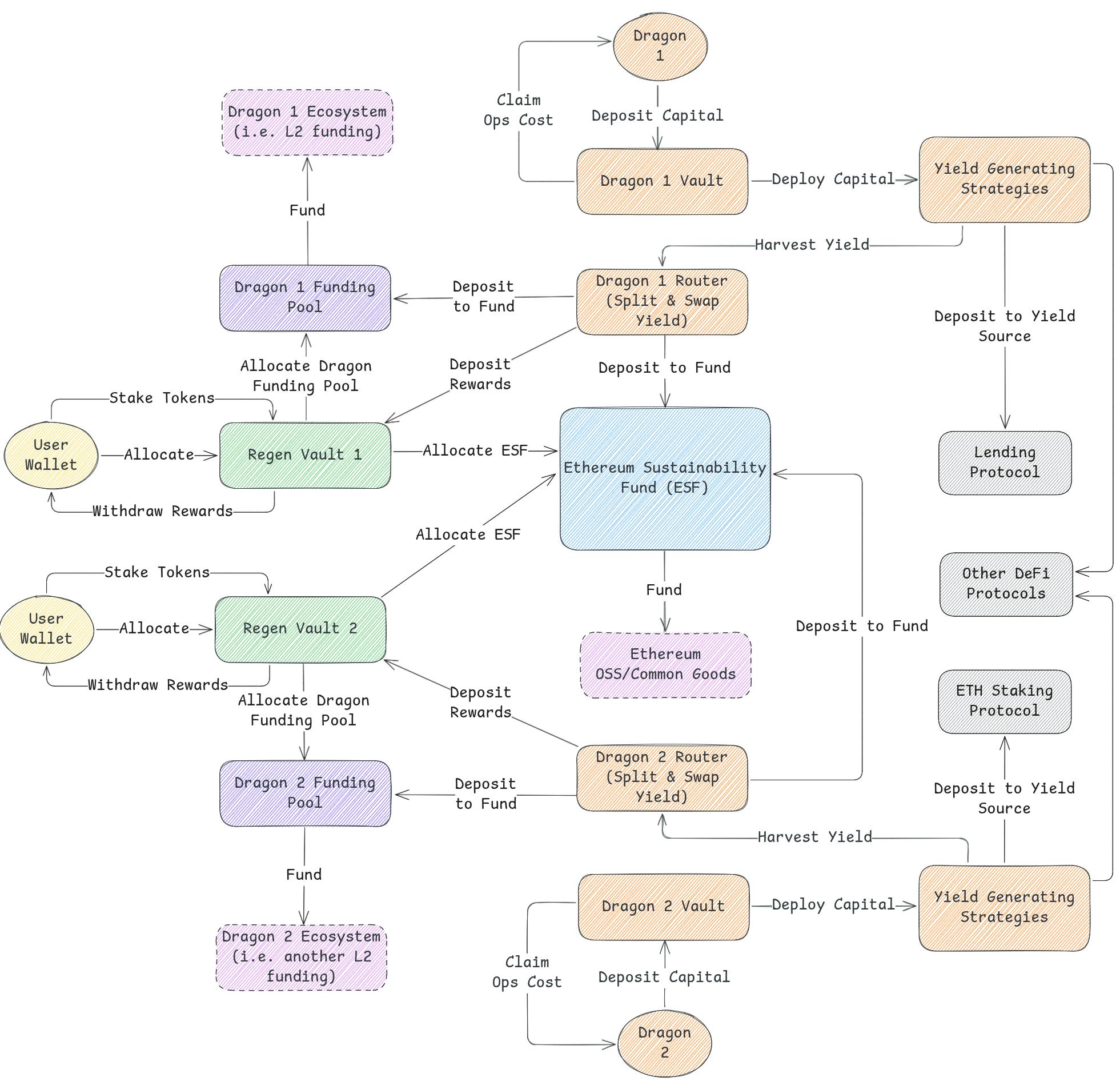 The diagram above illustrates how the system looks when Ethereum-aligned projects (Dragons) join the protocol and contribute to the Ethereum Sustainability Fund (ESF). The protocol allows multiple dragons to join and deposit capital into their own Dragon Vaults, while all of them contribute a percentage of their yield to the ESF.