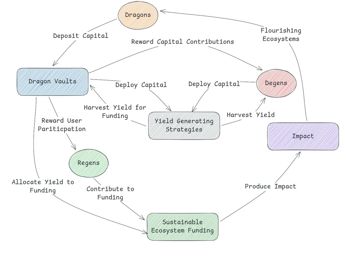 A Dragon can choose to stream a portion of the revenue generated in their Dragon Vault into the Regen Vault. This mechanism rewards active community members, who can then either withdraw their rewards or allocate them to fund projects within their own ecosystem or the broader Ethereum ecosystem (with Dragon Funding Pools providing matching funding that amplifies individual donations).